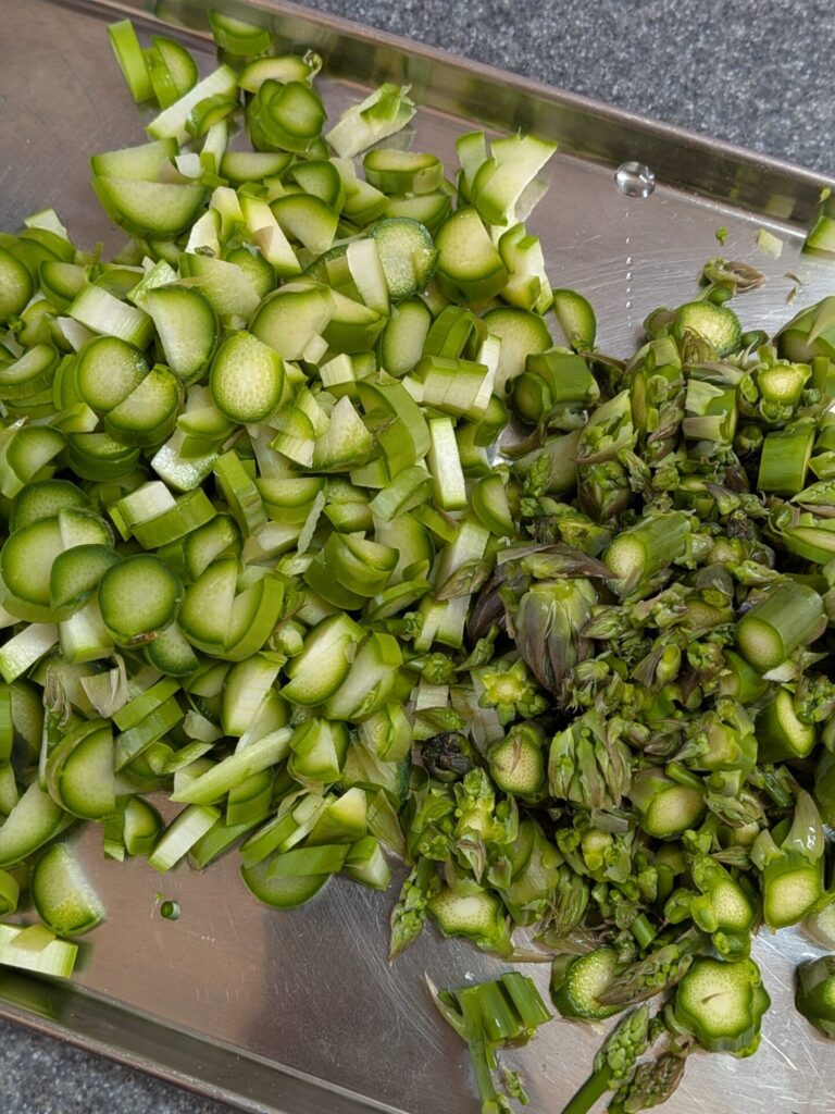 1. 재료 준비 아스파라거스 약 6개 분량을 준비해 주세요. 식감이 잘 살아나도록 아주 작은 크기로 쫑쫑쫑 잘게 썰어줍니다.