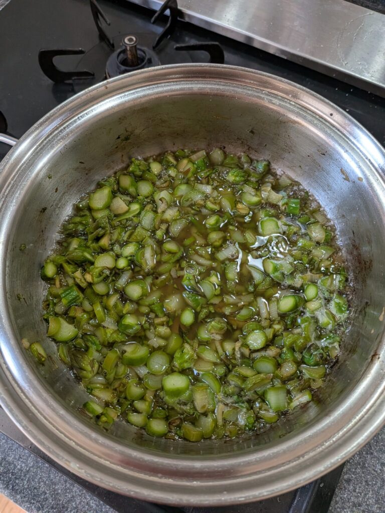 나중에 소개해 드릴 ‘아스파라거스 면 요리’를 만들다 보니 필러로 밀기 힘든 윗부분(봉오리 쪽)이 남게 되었는데요. “이 귀한 걸 어떻게 알뜰하게 쓸까?” 고민하다 떠올린 아이디어예요. 물론 아스파라거스 전체를 사용하셔도 좋고요! 저도 냉장고에서 아스파라거스를 추가 해 만들었으니까요.