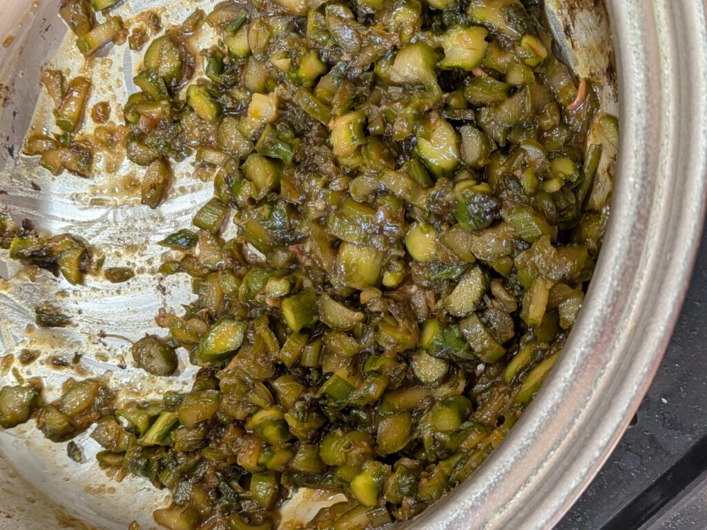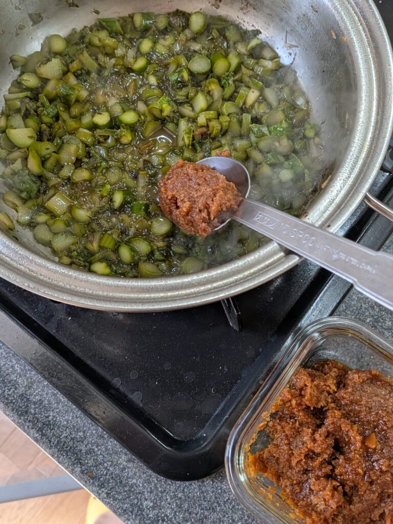 4. 미소로 마무리 아스파라거스가 부드럽게 익은 느낌이 들 때, 마지막으로 미소 1큰술을 넣고 자작하게 졸여줍니다. 농도는 아래 사진을 참고!
