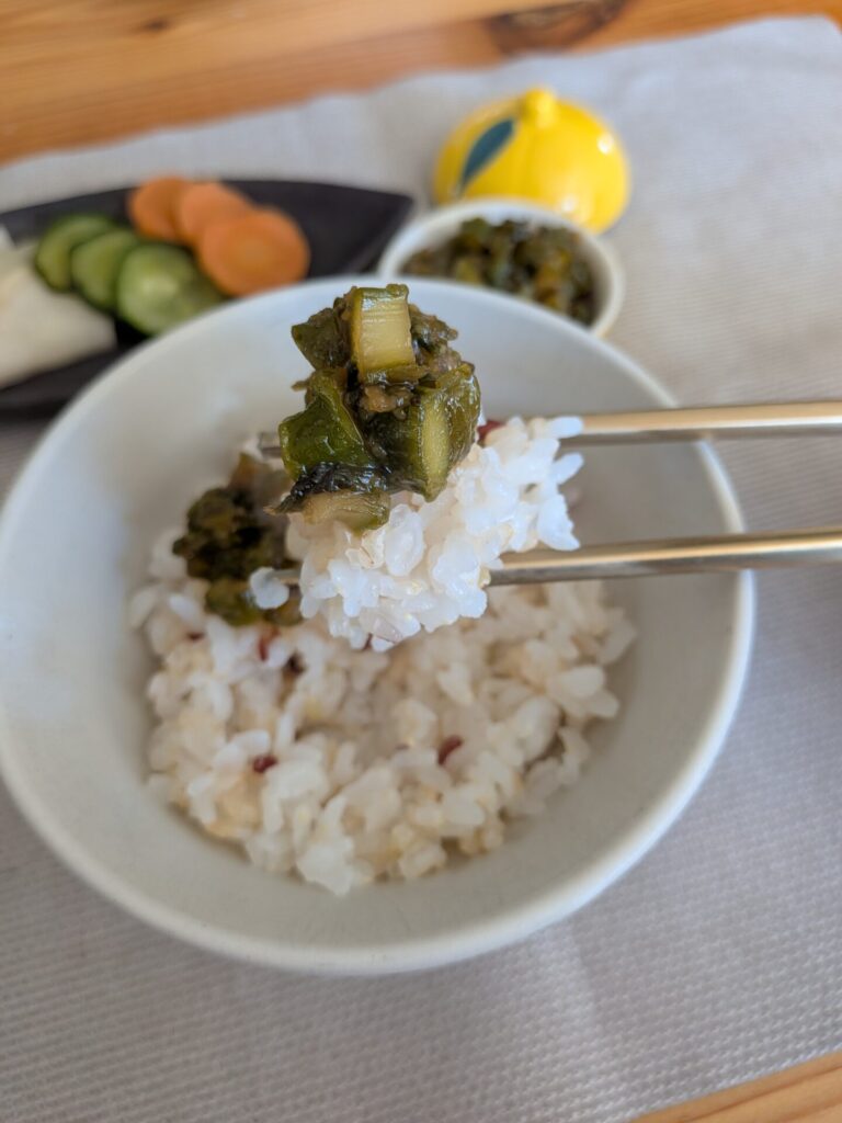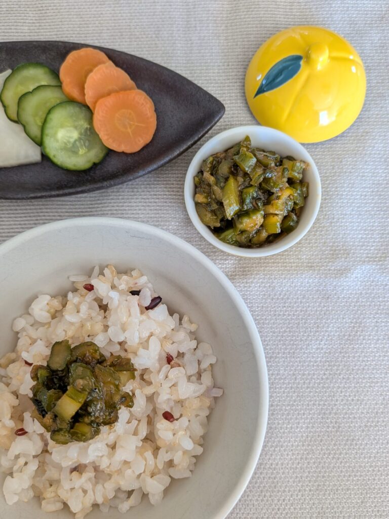 따끈한 갓 지은 밥 위에 이 아스파라거스 미소를 조금씩 올려 먹으면, 아스파라거스 특유의 기분 좋은 단맛과 미소의 구수함이 입안 가득 퍼집니다.