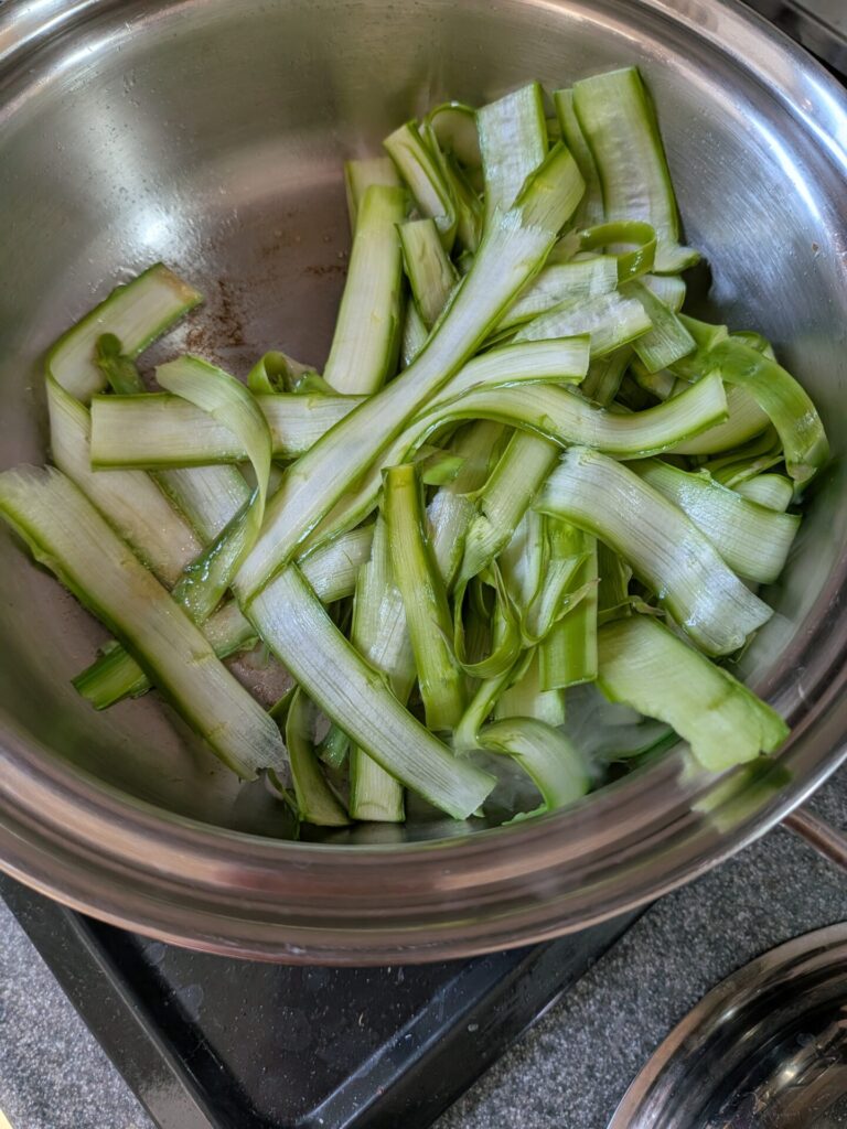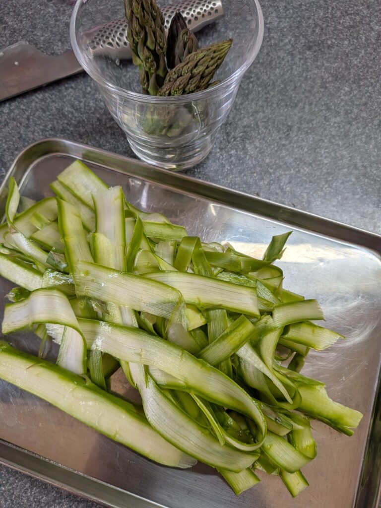 1. 면 뽑기 (필러 활용) 아스파라거스 줄기 부분을 감자 필러로 얇고 길게 슥슥 밀어주세요. 리본 파스타처럼 예쁜 면이 순식간에 만들어진답니다. 이때 손 조심하는 것 절대 잊지 마세요! 이 작업이 이 레시피의 가장 어렵고 고된 시간입니다. 고도의 집중력을 요구해요.