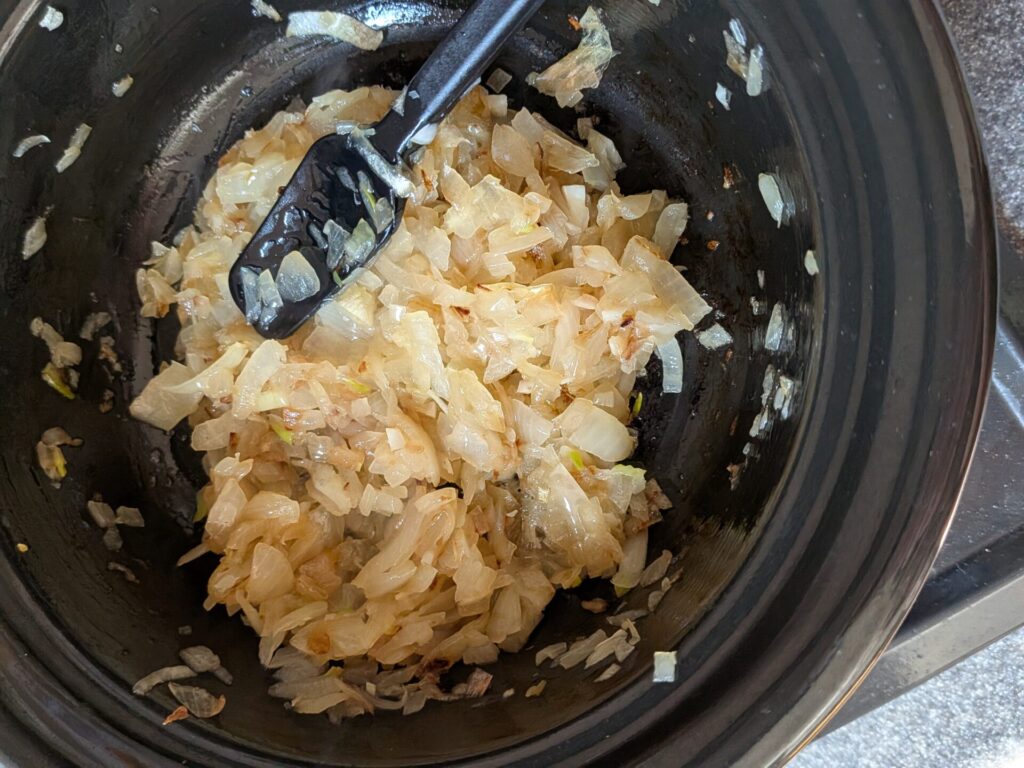 1. 양파 카라멜라이징 (코코나베에 바로!) 다진 양파 하나를 코코나베에 넣고 올리브오일에 볶아주세요. 이때 설탕 한 꼬집을 넣어주면 카라멜라이징 속도가 훨씬 빨라진다는 사실! 노랗고 달큰하게 볶아진 양파는 그대로 냄비 안에서 식혀줍니다.
