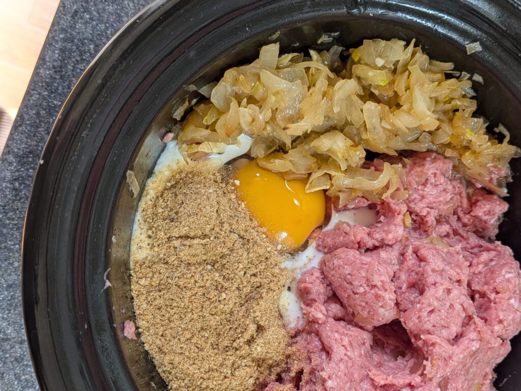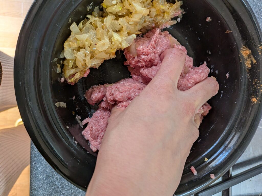 2. 고기 넣고 치대기 양파가 충분히 식으면 냄비 한쪽으로 살짝 밀어두고, 다짐육400g(소고기:돼지고기 1:1 비율)과 소금/후추/넛맥을 넣습니다. 고기에 충분히 점성이 생길 때까지 치대다가 옆에 둔 양파와 섞어주세요.