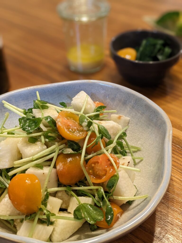이렇게 완성된 마 샐러드는 아삭아삭하면서도 부드러운 식감이 일품이에요.
