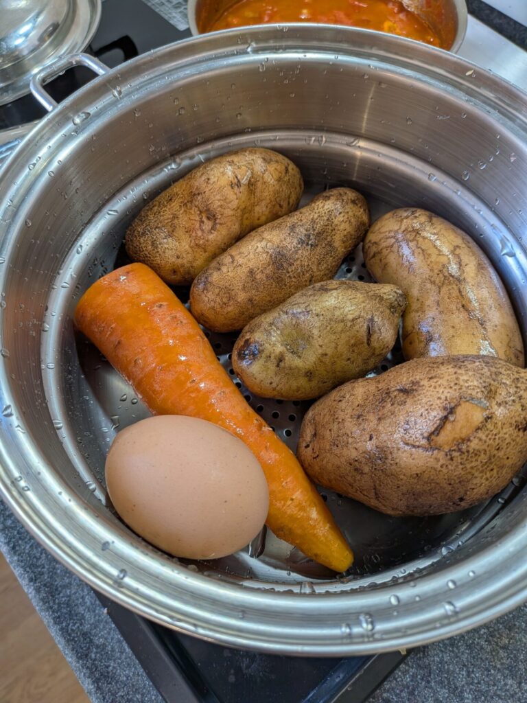 함께 찌기: 냄비에 감자 5개와 당근 1개, 계란 1개를 넣고 함께 찝니다.