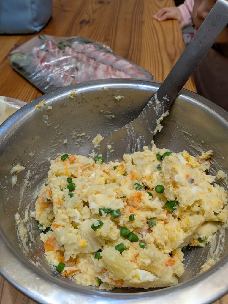 마무리: 마요네즈는 감자의 온도가 약 40°C 정도로 식었을 때 넣어주세요. 이는 일본 마요네즈 회사(큐피)가 추천하는 온도인데요. 감자가 너무 뜨거우면 마요네즈의 기름 분리가 일어나 겉돌기 쉽고, 너무 차가우면 잘 섞이지 않기 때문이죠. 40°C는 마요네즈가 감자에 부드럽게 스며들어 가장 잘 어우러지는 황금 온도입니다. 마지막으로 소금, 후추로 간을 조절해 버무려주면 끝!
