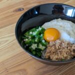아래 덮밥 사진의 하얀게 마, 초록색 별 모양 채소가 오크라, 갈색이 낫또에요. 이런 네바네바식감의 식재료를 모아 밥 위에 얹어 먹는 요리를 일본에서는 네바네바돈부리ねばねば丼이라고 해요!